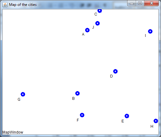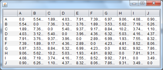 This is by tarting generating coordinates of the 10 cities at random as A (5.29,7.99), B (4.65, 2.47), C (6.10, 9.70), D (7.12, 4.39), E (7.85, 0.50), F (4.95, 0.60), G (1.12, 2.40), H (9.74, 0.09), I (9.37, 7.89), and J (5.95, 8.60)