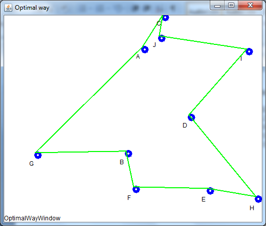 The tour and its length are found to be: A-> G-> B-> F-> E-> H-> D-> I-> J-> C-> A => 32.94. This is much shorter than the 5 example tours above, right?