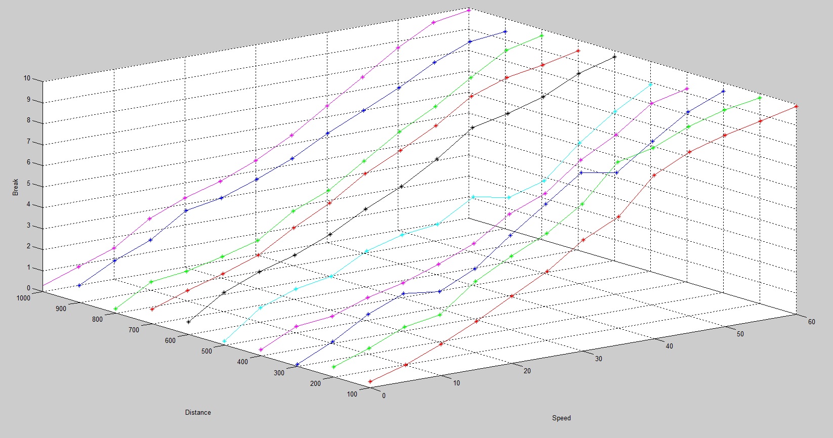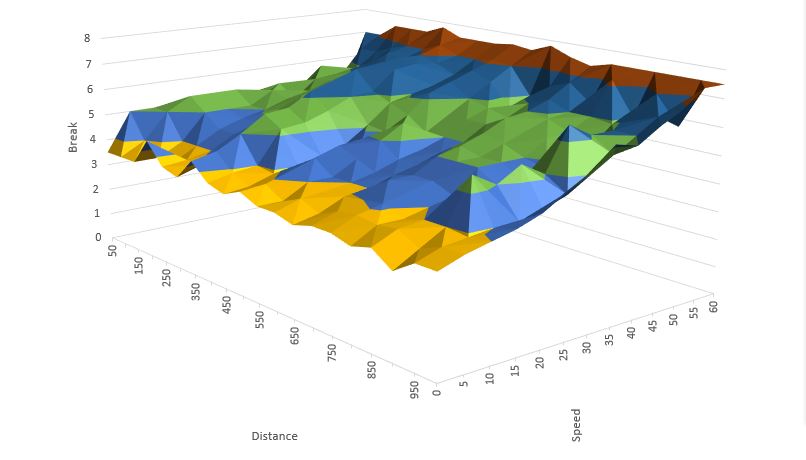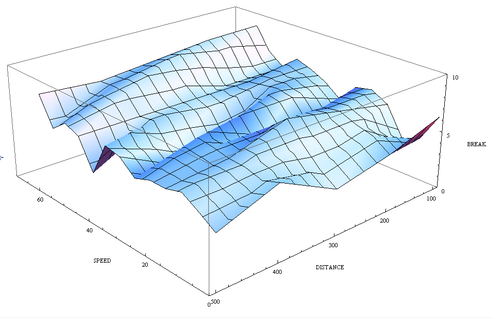 Draw surface by plotting points on 3D space of speed (x-axis) - distance (y-axis) - break (z-axis) under a set of 10 rules