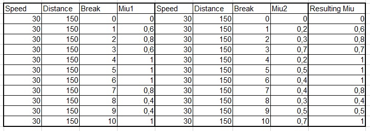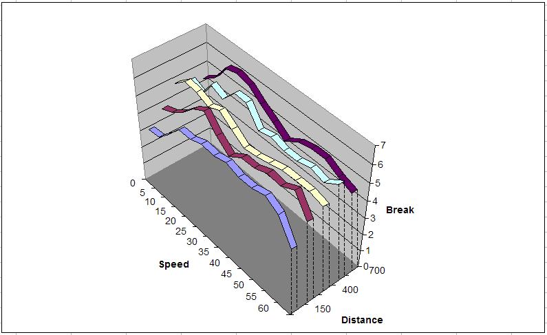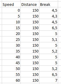 Big table of all combinations of speed, distance and break