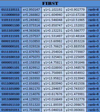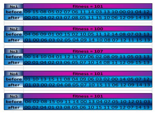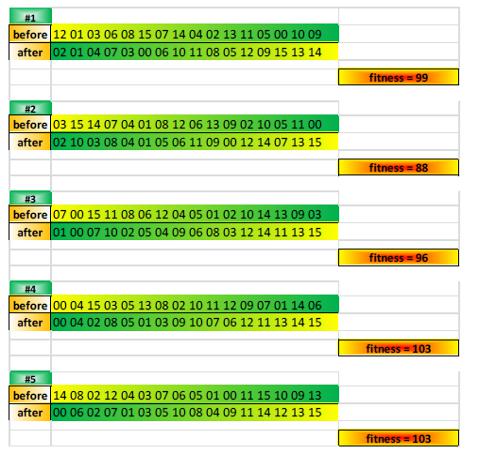 A result of applying the chromosome to a set of 4 random order of integers from 1 to 16.