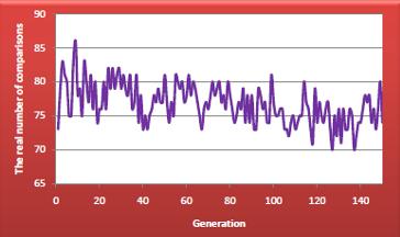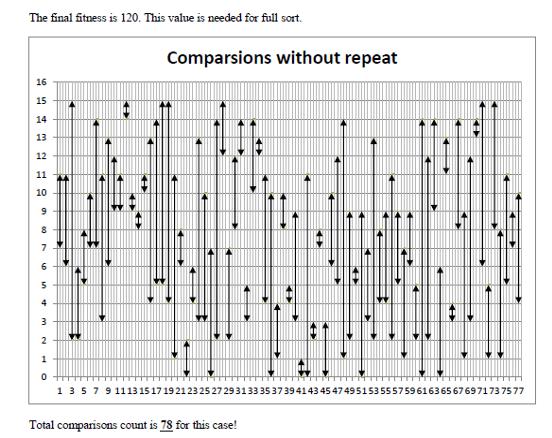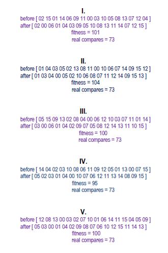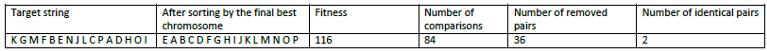 Her target string of 16 letters, its sorted result, how good is this sorting (= fitness), the number of actual comparisons, the number of removed comparisons due to multiple comparisons of a same pair and self comparisons, and the number of self comparisons