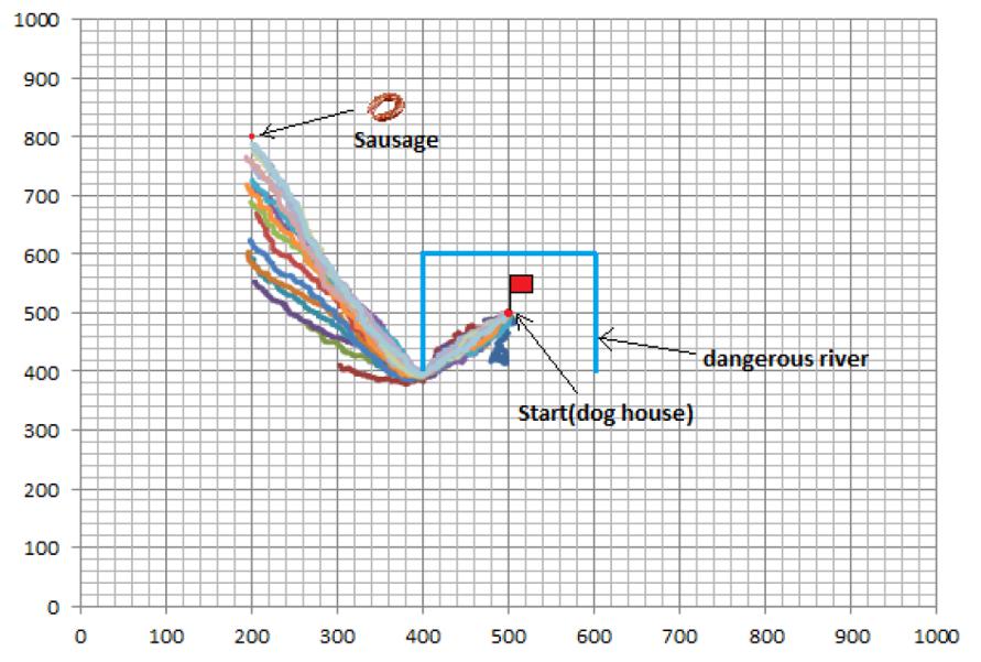 Important message of the result is, all the dogs arrive to only one sausage despite that two sausages exsist.