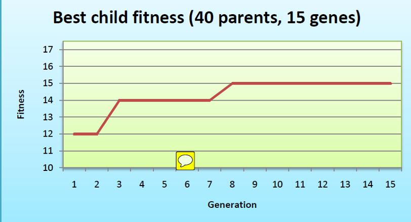 Note that y-axis is average fitness. Therefore fitness = 1 means all the chromosomes reach to the solution.