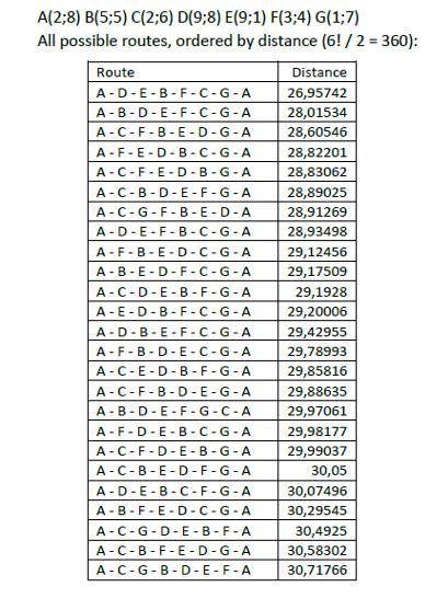 As additional work, all the possible 6!/2=360 routes were calculated. Only the part is shown here, though.