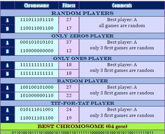 20 players each having 64-bit binary chromosomes. One game is made up of 12 rounds with 3 random preparation rounds + 9 serious rounds where 1 against 1 gets 5; 1 against 0 gets 2; 0 against 1 gets 0; and 0 against 0 gets 3 are counted in last 9 rounds. Each player plays with other 19 players in the population and Fitness is a total points of these 19