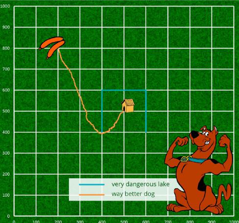 Lucky dog problem in gridworld (0,0)-(1000,1000) with dog house at (500,500) and sausage at (200,800)