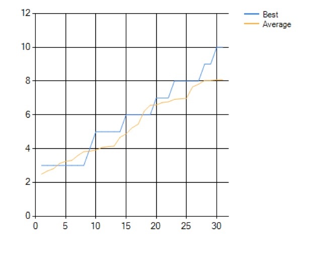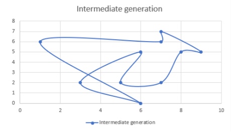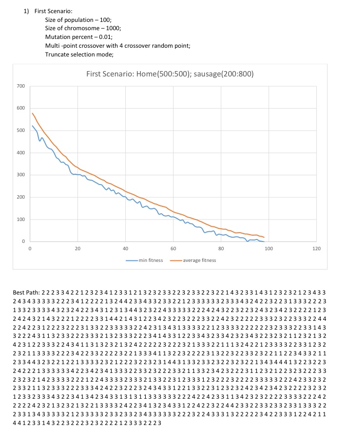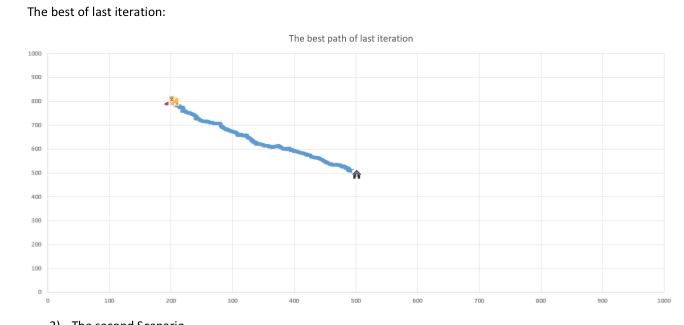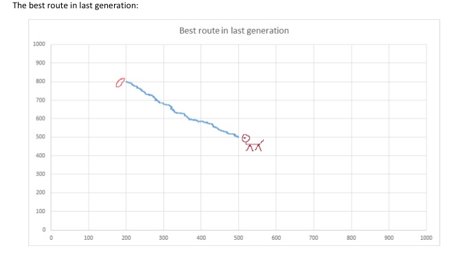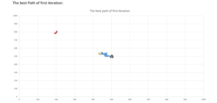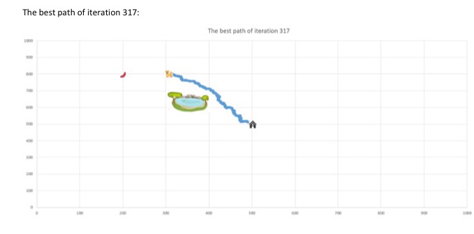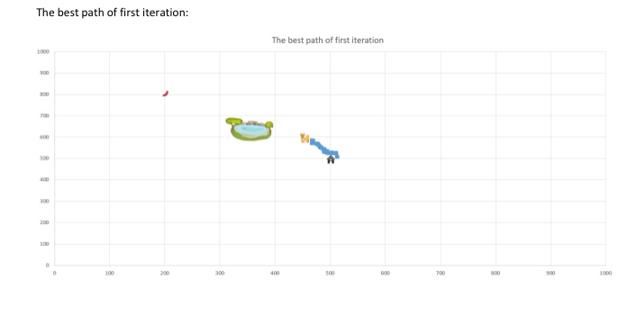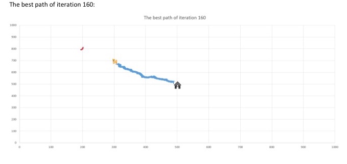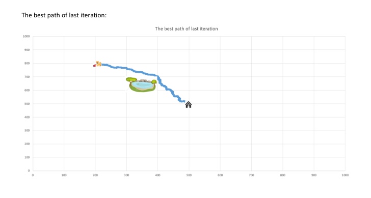 An evolution of dogs in a plain field, and the routes of best dog in the final generation.
