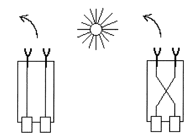 By a kind of incremental methodology Braitenberg increases the complexity of a series of vehicles, Vehicle 2 being just a kind of duplication of the first one, with two motors and two sensors in the respective corners of the trunk, and coming in two distinct varieties depending on whether the right sensor is connected to the right motor and vice versa or they are cross-connected (see Figure 2). If there is no crossing, the motor on the side of the body, which gives the highest exposure to the sensor of the stuff that excites the sensor, will tend to move faster, so that as a result, the vehicle will turn away from the source (it will 'fear' it, as Braitenberg says). In the vehicle with crossing the resulting movement will turn the vehicle toward the source (indicated by the sun icon) and will eventually hit it.